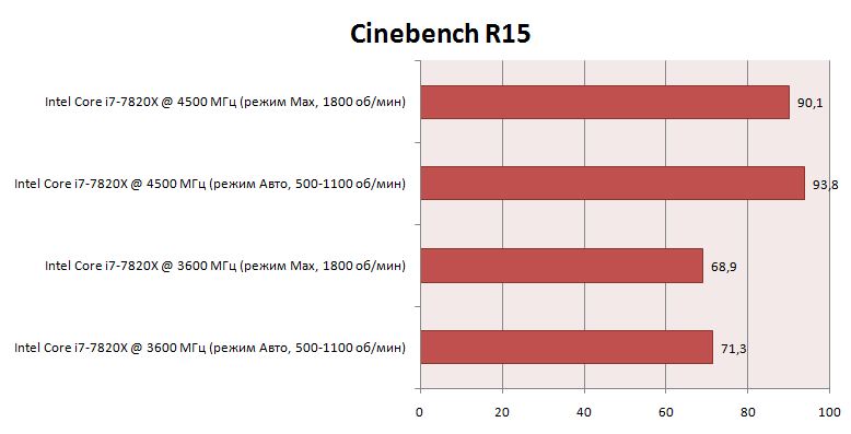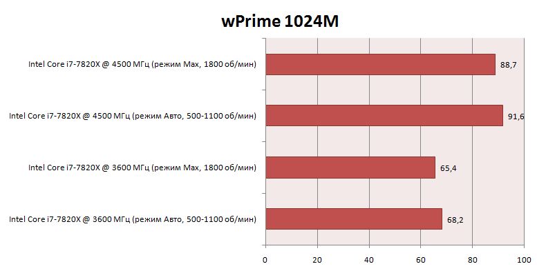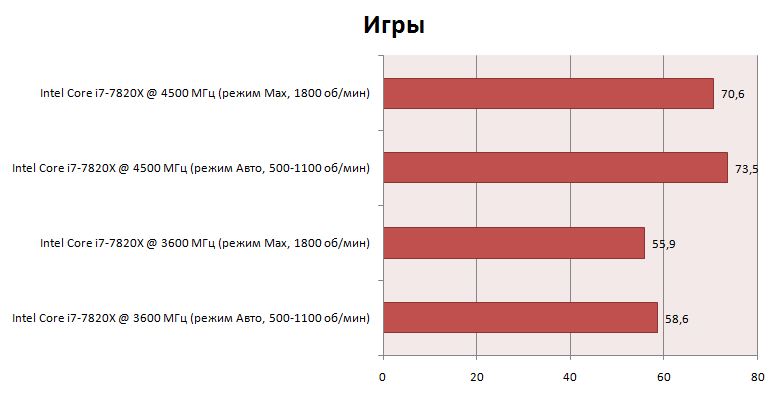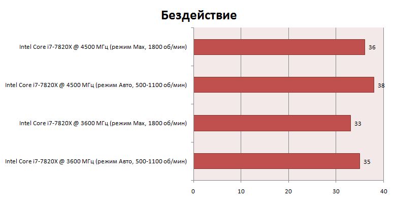 Тестирование кулера проводилось в несколько этапов. Вначале мы проверяли эффективность кулера при частоте процессора 3600 МГц, при этом скорость вентилятора регулировалась автоматически, а потом, на этой же частоте, скорость вращения вентиляторов фиксировалась на максимальных оборотах. Затем, те же действия проводились уже на частоте 4500 МГц.