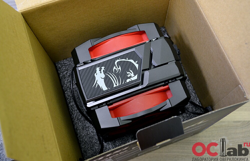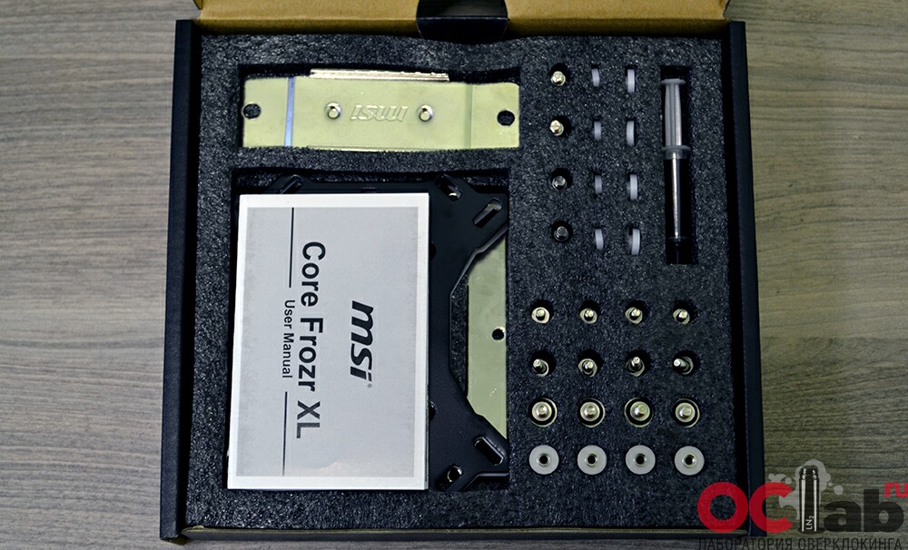 Открыв упаковку, видим небольшой футляр со всеми аксессуарами для MSI CORE FROZR XL. Достав слой вспененного защитного материала, видим самое главное содержимое этой коробки – кулер MSI CORE FROZR XL. Даже с такого ракурса, при первом взгляде, он буквально завораживает своим необычным внешним видом и массивностью!