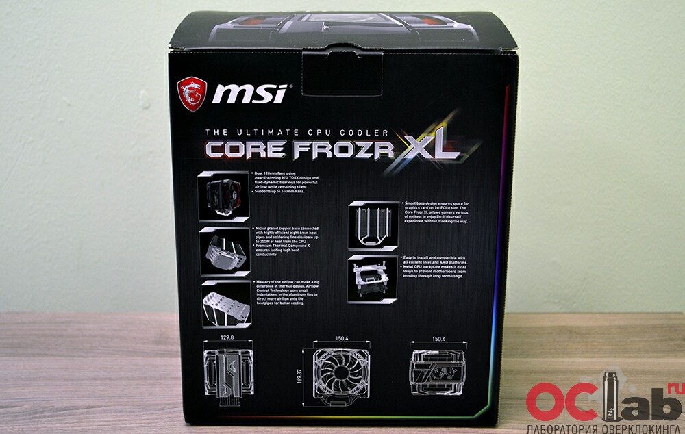 Кулер MSI CORE FROZR XL поставляется в большой красивой коробке, оформленной в фирменном стиле компании. Упаковка вместе с содержимым получилась довольно увесистой, почти 2 кг «никелированного счастья». Помимо того, что упаковка красивая она еще и информативная, производитель постарался разместить на ней всю полезную для пользователей информацию.