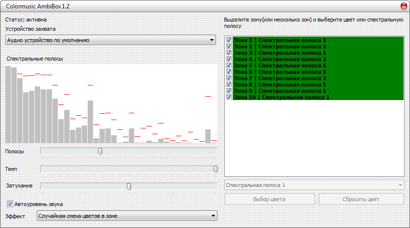 В первую очередь стоит правильно сопоставить зоны захвата цвета с реальным расположением каждой светодиодной ленты. Для этого в ПО есть кнопка «Показать зоны захвата». После ее нажатия появятся зоны, которые можно менять местами, увеличивать, уменьшать и перемещать в любое место на экране. Также можно отключать выборочно каждую из зон для того, чтобы правильно сопоставить их с расположением светодиодных лент.