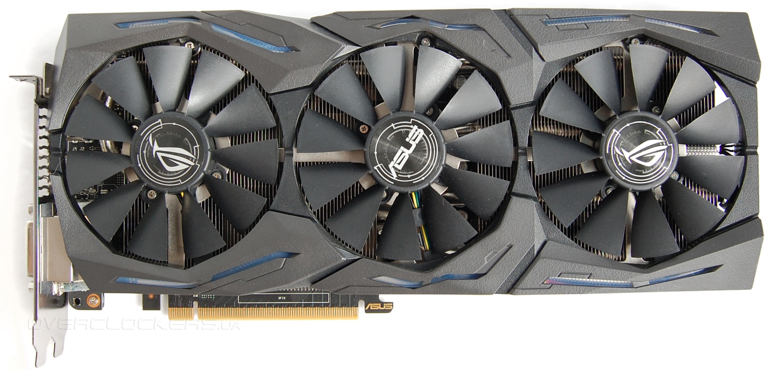 Массивная карта выглядит очень внушительно. И хотя для GeForce GTX 1060 заявлен невысокий уровень TDP, производитель установил на ASUS ROG Strix крупный кулер с тремя вентиляторами. Аналогичная система охлаждения используется в GeForce GTX 1070/1080 этой же линейки Strix. Полная длина ASUS около 30 сантиметров.