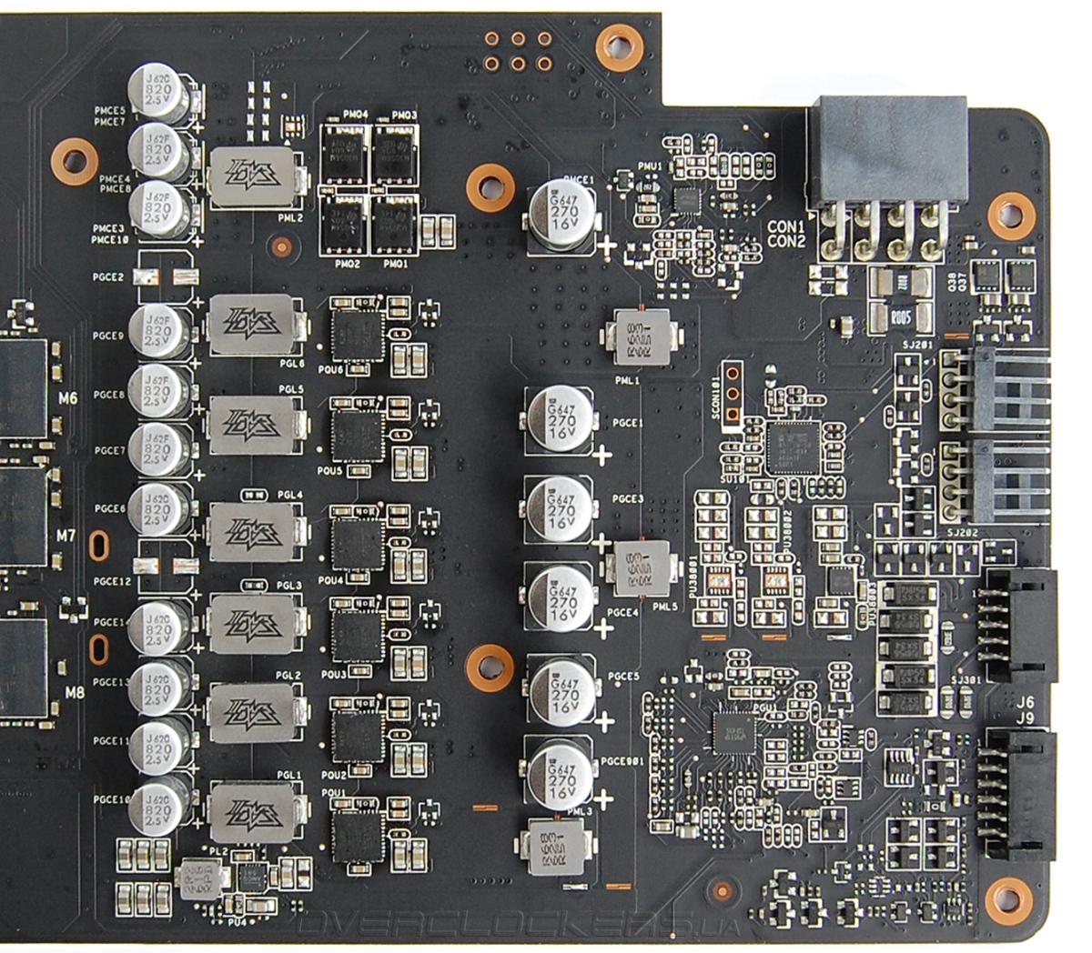 Подсистема питания GPU насчитывает шесть фаз на базе интегральных сборок DrMOS. У края платы находятся разъемы для подключения вентиляторов и подсветки. Рядом с ними дополнительные разъемы для внешних вентиляторов. Благодаря новой технологии ASUS FanConnect вы можете подключать корпусные вентиляторы с ШИМ-регулировкой прямо к видеокарте, и она будет управлять их оборотами в зависимости от своего нагрева.