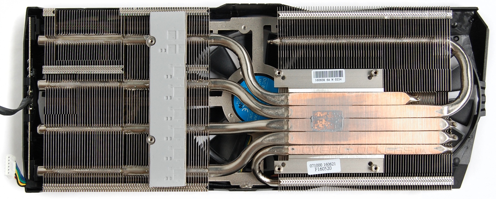 Система охлаждения оказалась не просто идентичной той, что используется в старших видеокартах, это абсолютно такая же конструкция с пятью тепловыми трубками и технологией прямого контакта с поверхностью GPU. Вот только сам кристалл GP106 более мелких размеров, из-за этого с ним контактируют только две тепловые трубки. Боковые трубки тоже участвуют в общем теплообмене, но играют не столь важную роль.