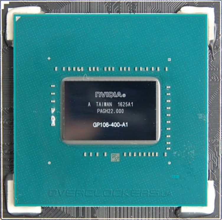 Графический процессор GP106-400-A1 прямоугольной формы. Он насчитывает 1280 ядер CUDA, 80 текстурных блоков и 48 ROP при 192-битной шине памяти.