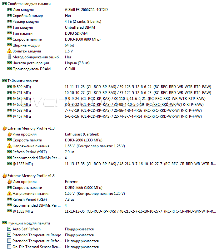 В SPD модулей прописаны шесть стандартных профилей, отвечающих требованиям JEDEC, и два XMP, отличающиеся небольшими корректировками второстепенных задержек.