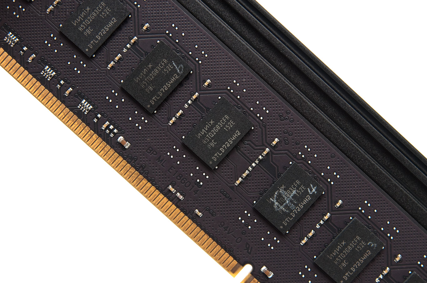 Каждая планка набрана шестнадцатью микросхемами общим объемом 4 ГБ. Рабочая частота составляет 2666 МГц при таймингах 11-13-13-35-2T и напряжении 1,65 В. Параметр Command Rate в явном виде на этикетке не указан — придется его выставить либо вручную, либо воспользовавшись профилем XMP, который, кстати, полностью установит все необходимые параметры.