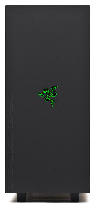 Дизайн корпуса NZXT S340 в варианте от Razer можно описать как строгий и лаконичный. Особенно это видно на примере фронтальной панели, покрытой цельным черным листом металла, на котором выделяется один единственный элемент — подсвечиваемый зеленым цветом логотип Razer.