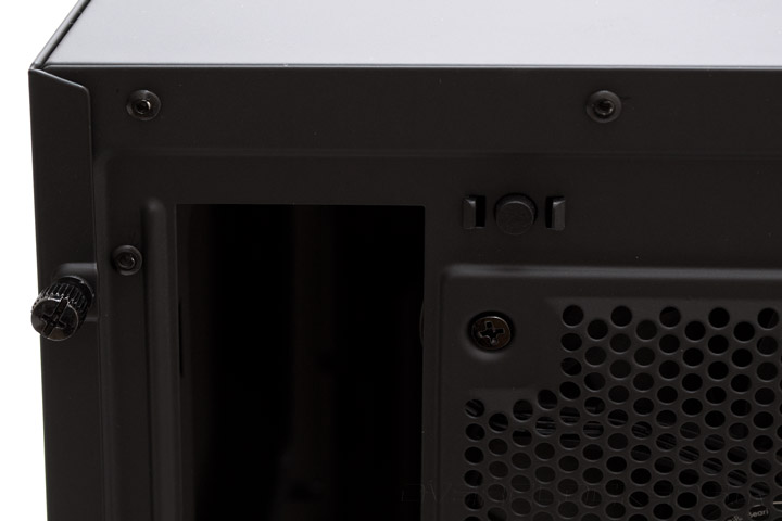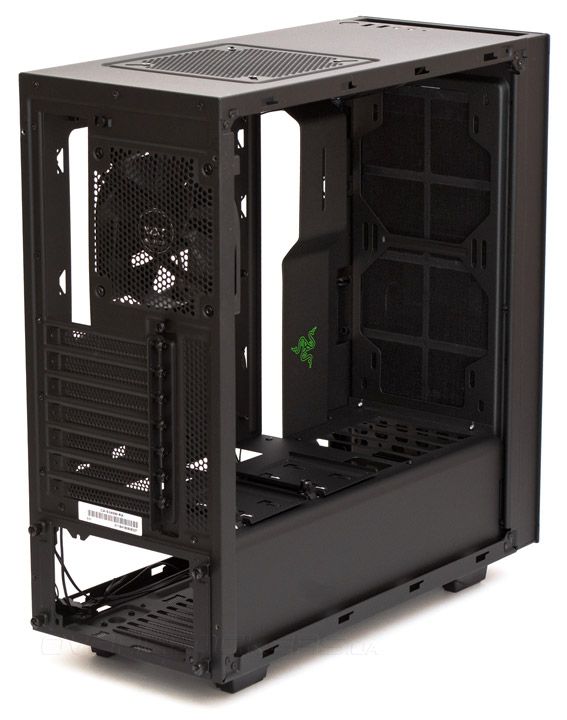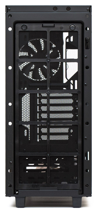 Сзади все очень стандартно. За сотовой решеткой располагается вытяжной 120-мм вентилятор, слотов расширения семь, все закрыты вентилируемыми многоразовыми заглушками, которые удерживаются винтами с накатанной головкой. Технологическое отверстие за винтами закрыто еще одной вертикальной сплошной заглушкой, удерживаемой еще одним винтом с накатанной головкой. Правее от слотов расширения есть дополнительные вентиляционные отверстия. Посадочное место блока питания оснащено съемной планкой, сидящей на четырех винтах с накатанной головкой. Она необходима здесь потому, что БП устанавливается в шасси только через заднюю панель — прикрепляется к планке и задвигается внутрь. Ориентировать БП можно вентилятором вниз или вверх, на свое усмотрение. Последний вариант, правда, не имеет особого смысла, так как блок питания будет практически лишен вентиляции.