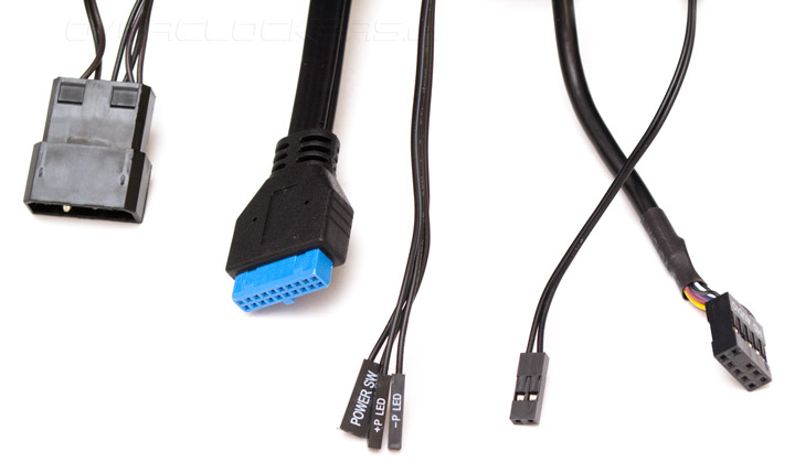 В набор проводов входит один «молекс», отвечающий за питание двух зон подсветки и двух вентиляторов, одна колодка USB 3.0, три стандартных кабеля от индикаторов работы системы, активности накопителей и кнопки старта системы, а также провод HD Audio. Длина всех шнуров достаточная, цвет изоляции проводки полностью черный.