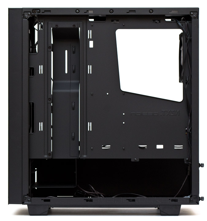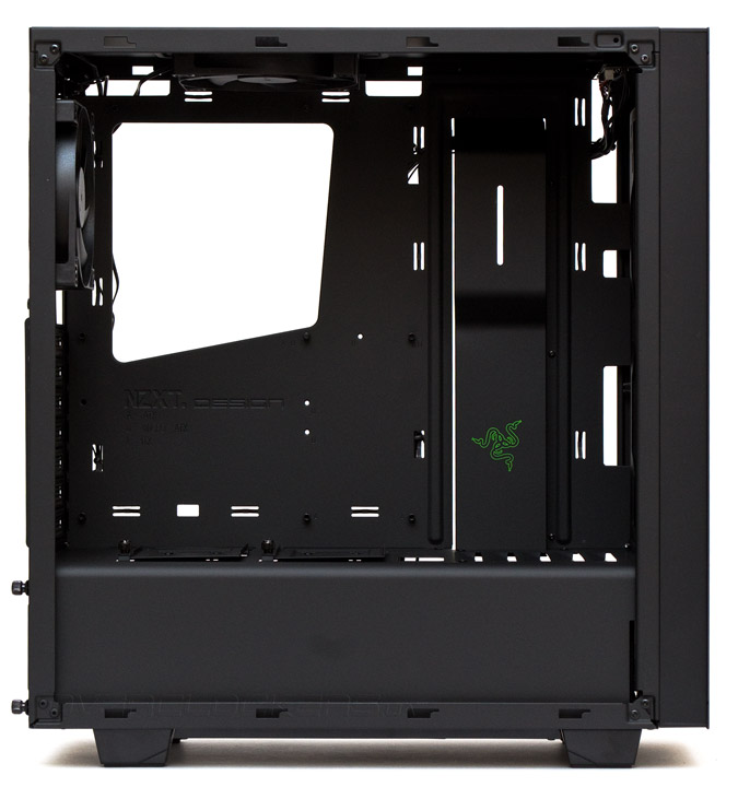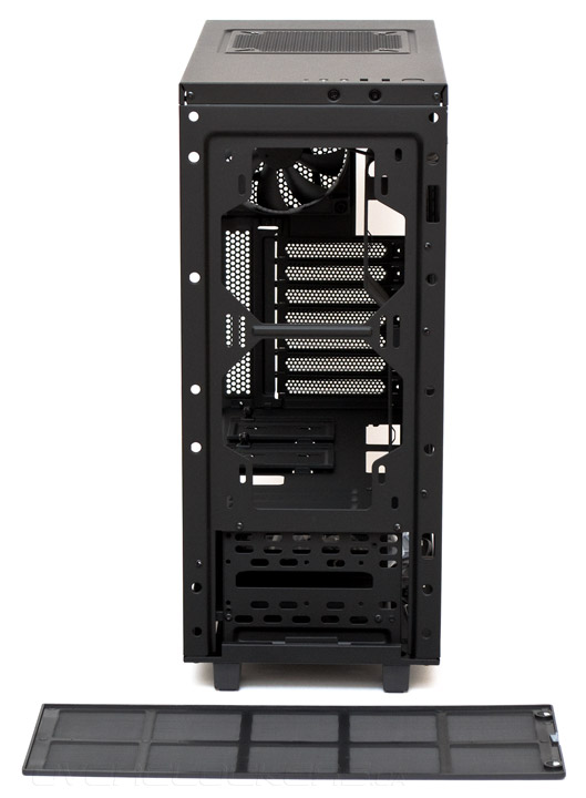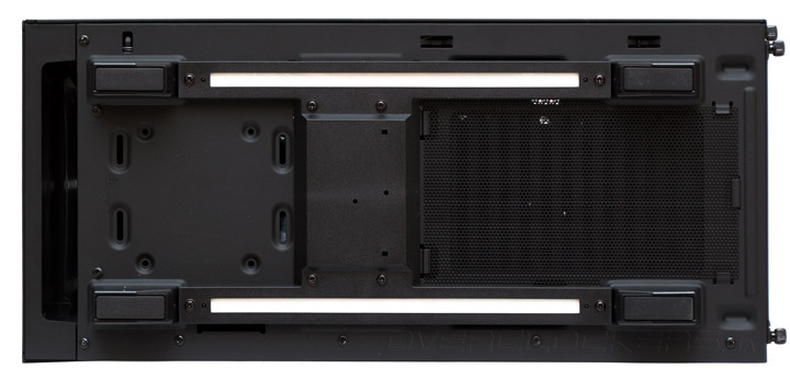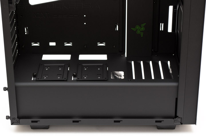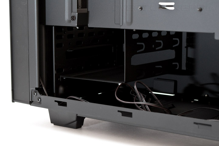 В нижней части корпуса расположен кожух, образующий собой отдельный от остального объема шасси отсек. В данном отсеке помещается блок питания, большинство кабелей и несколько накопителей. В самом кожухе есть три отверстия для протяжки проводов, и пять вентиляционных отверстий спереди для обдува накопителей. Ниже материнской платы, с помощью винтов с накатанной головкой, закреплено две съемные корзины для 2,5″ накопителей.