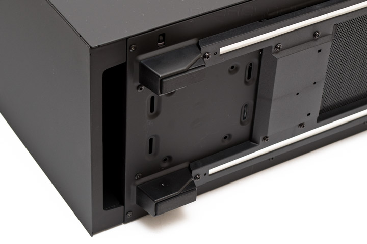 Пластиковые ножки прорезинены снизу и имеют высоту 27 мм. Вырез в передней панели снизу служит как для упрощения ее демонтажа, так и в качестве еще одного вентиляционного отверстия.