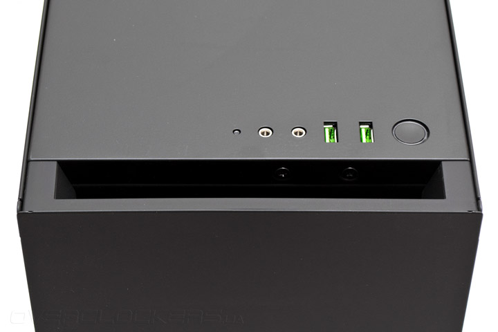 Внешние порты расположены на передней грани верхней панели. Слева направо построились точечный индикатор активности накопителей (зеленого цвета), два 3,5-мм аудиоразъема, два порта USB 3.0 зеленого цвета и небольшая круглая кнопка запуска системы (с подсвечиваемым зеленым ободком). Перед ними находится вентиляционное отверстие, представляющее собой вырез в передней панели, через который воздух попадает в корпус.