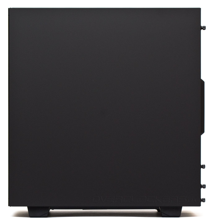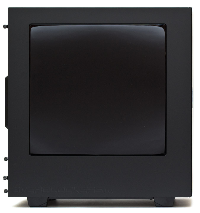 Левая боковая панель сплошная. Конструктивно она сделана так, что полностью закрывает боковину передней панели. Из-за чего возникает ощущение, что корпус состоит из плотно подогнанных между собой металлических пластин. Панель держится на двух несъемных винтах с накатанной головкой, сдвигается по направлению назад. Ручка для облегчения процесса монтажа тоже есть.