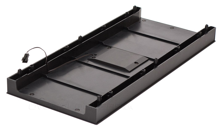 На первый взгляд здесь не очень много места и приспособлений для укладки проводов, но впечатление обманчивое. Да, в самых узких местах имеется не более 18 мм расстояния от поддона до правой боковой панели. Однако, самое большое скопление проводов все равно попадает в район декоративной выступающей планки впереди, либо в нижний отсек, где можно не напрягаясь спрятать практически любой клубок кабелей. Вырез под усилительную пластину процессорного кулера, несмотря на слегка нестандартную форму, подойдет к любому типу процессорного разъема. Для протяжки мелких проводов есть шесть небольших отверстий по периметру поддона, а для крепления кабельных стяжек найдется 20 проушин, расположенных в правильных местах.