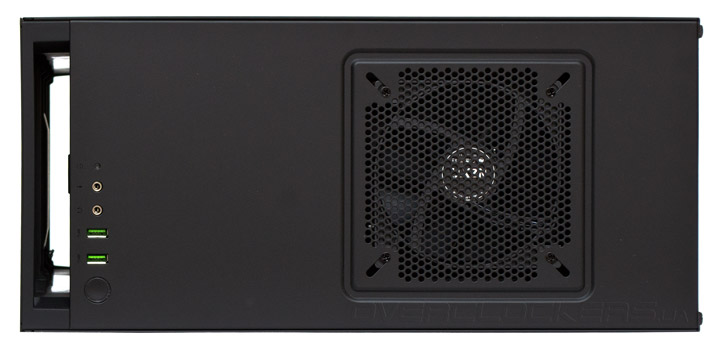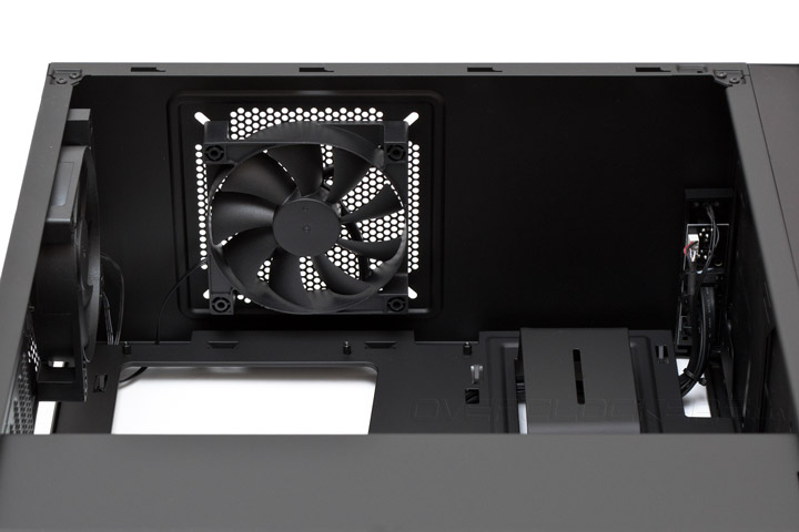 Под верхней панелью установлен на вытяжку один 120-мм вентилятор. При желании его можно заменить на 140 мм. Запас пространства от кромки материнской платы до верхней панели не превышает 25 мм, следовательно, ничего кроме стандартного пропеллера туда поставить не выйдет.