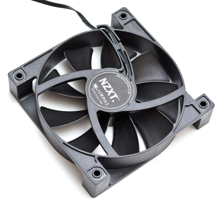 120-мм вентилятор принадлежит к серии NZXT FN V2, основанной на втулочном подшипнике скольжения с винтовой нарезкой. Крыльчатка способна стартовать с 4 В и 500 об/мин, не превышая уровень шума в 35 дБ (А). При 7 В (900 об/мин и 40 дБ (А)) вентилятор все еще остается бесшумным. Максимальная скорость составляет 1200 об/мин при 46 дБ (А) шума, что в целом ощущается на слух, но не вызывает особого раздражения. Длина трехконтактного шнура питания без оплетки — 510 мм. Маркировка и электрические характеристики видны на фотографии. Особых призвуков данная модель не имеет, подшипник издает едва уловимое шуршание, а крыльчатка отзывается аэродинамическим шумом лишь на высоких скоростях вращения. Вентилятор очень хорош в плане низкого уровня шума и вряд ли потребует замены вплоть до полного износа. Производитель обещает до 40000 часов наработки данной модели на отказ.