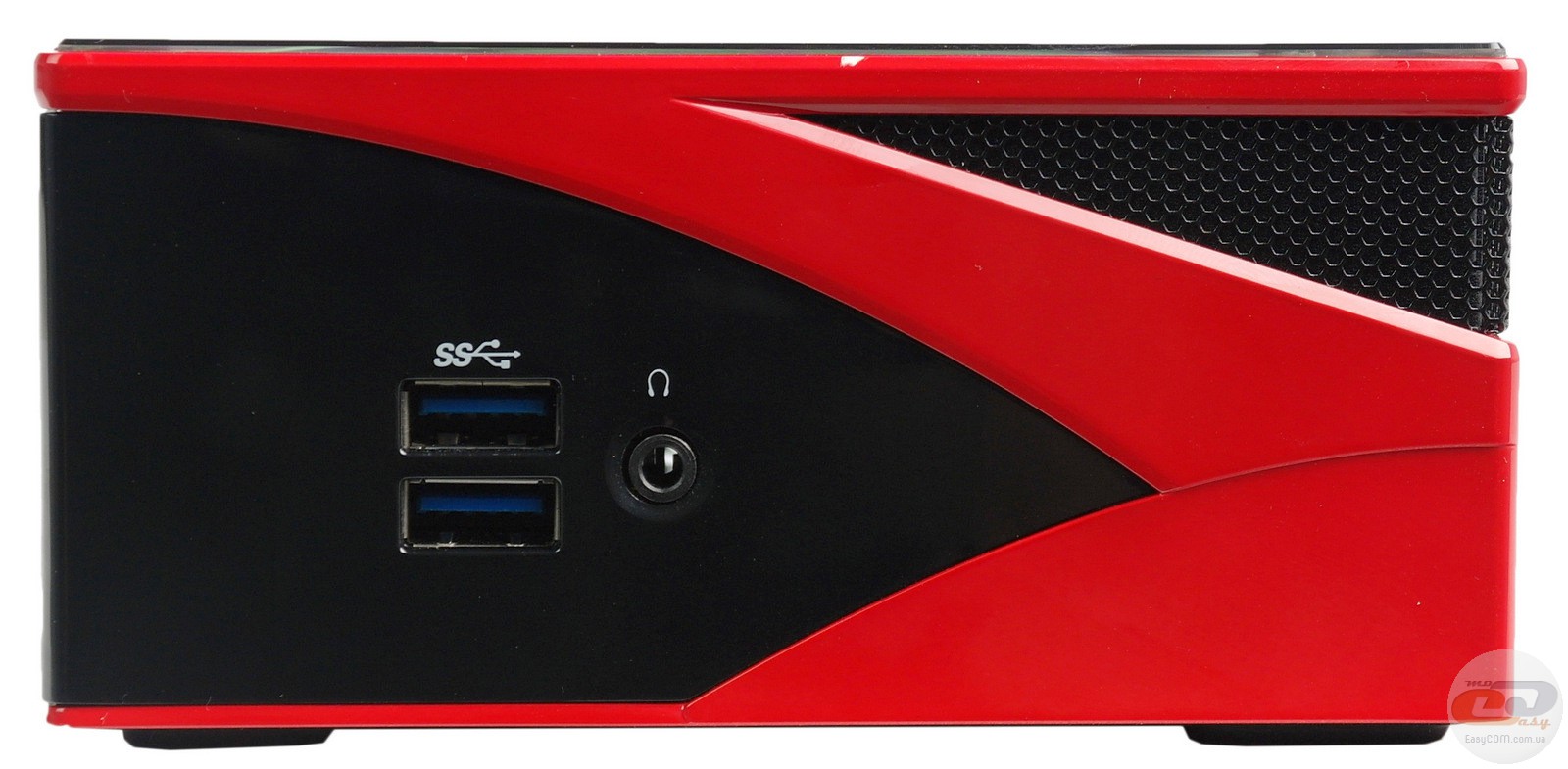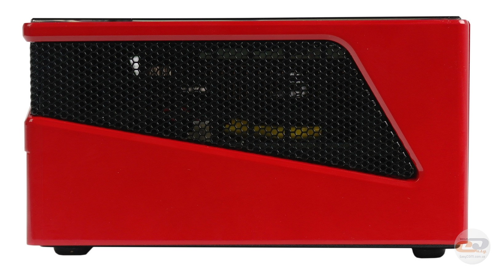 Тестируемая модель выполнена в компактном корпусе прямоугольной формы, окрашенном в фирменные цвета AMD – черный и красный. Его габариты составляют 59,6 x 128 x 115,4 мм. Внешние элементы выполнены из пластика, тогда как внутри используется алюминиевая основа для крепления всех комплектующих. Отметим, что красные вставки и верхняя панель достаточно маркие. Но если красный цвет хорошо скрывает отпечатки, то о привлекательном виде верхней панели придется позаботиться.