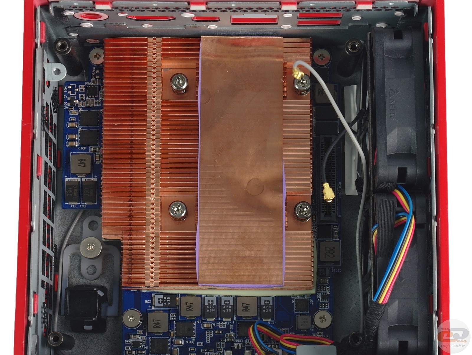 Как видим, для охлаждения графического ядра и чипов видеопамяти используется массивный медный радиатор, сквозь ребра которого беспрепятственно циркулирует воздушный поток, генерируемый двумя предустановленными в корпусе ПК вертушками. На них мы остановимся немного позже.