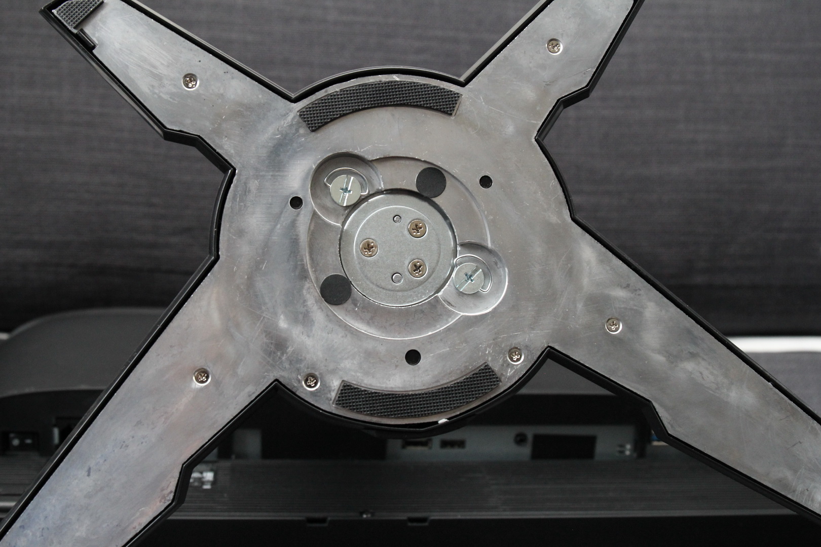 Отвертка для сборки основания и подвески панели не потребуется. На нижней части основания есть два «барашка», при помощи которых штанга крепится к поворачивающейся подставке, для панели имеются четыре защелки, которые садятся в пазы с характерным клацаньем. К слову, стоит быть внимательным при разборке монитора – чтобы отсоединить панель от штанги, нужно просто нажать на едва заметную кнопку на нижней грани. Иначе ничего не выйдет, крепление можно оторвать разве что «с мясом».