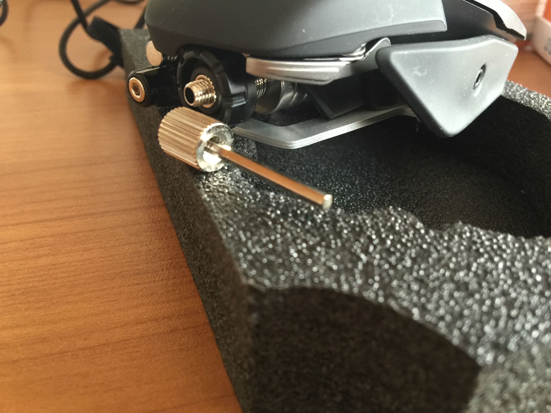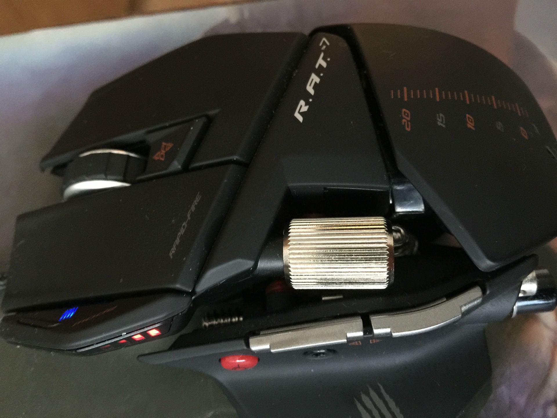 Для того, чтобы изменить длину мышки, необходимо ослабить фиксирующий винт, после чего ослабить замок и изменить длину устройства. При этом длина Mad Catz R.A.T.7 может варьироваться от 10.7 см до 12.5 см.