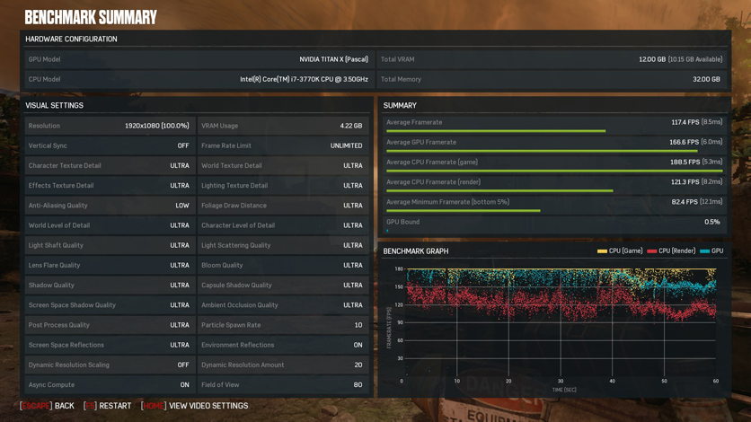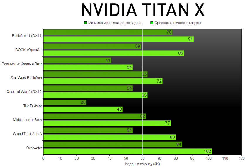 Как и в случае с Battlefield 1, в Full HD игра практически не оторвалась от результатов GTX 1080 — 139 кадров в секунду с незначительным отрывом по минимальному fps. Сказываются ограничения, наложенные остальными компонентами. А в 4K TITAN X выдаёт 85 кадров в секунду, что на треть лучше результатов GTX 1080. На уровне Lazarus Labs минимальный fps падает всего лишь до 59 кадров, что можно списать на погрешность, которая нивелируется включением Vulkan API в настройках игры.