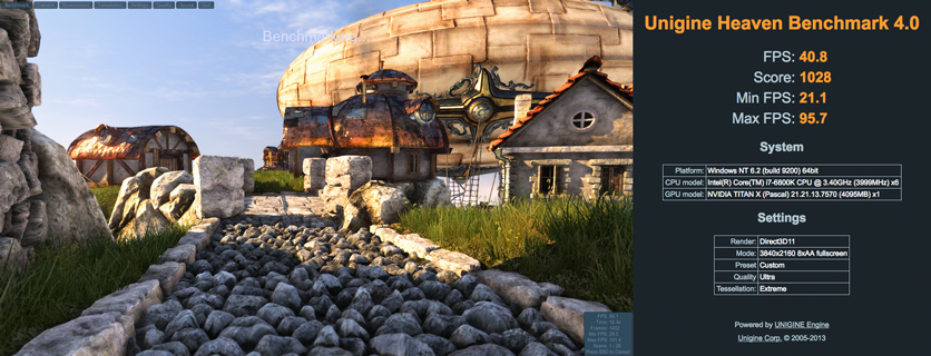 Но с повышением разрешения отрыв растёт. В 4K при тех же настройках видеокарта выдала 1028 очков и не только преодолела психологический барьер, но ушла ещё дальше от GTX 1080, которая в том же режиме набирает примерно 650 очков. Учитывая приближённость этого бенчмарка к играм — позиции TITAN X для 4K только усиливаются.