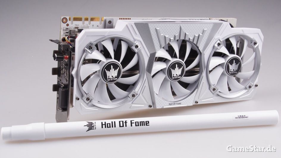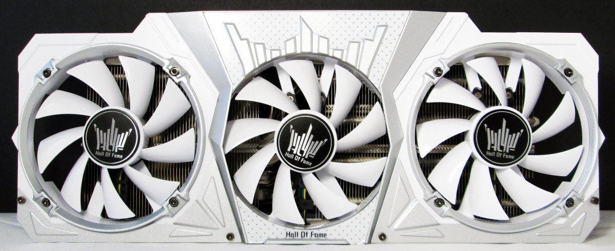 Кожух системы охлаждения линейки Hall Of Fame выполнен в бело-серебристом цвете, и карточка впечатляет своими габаритами, длина - 330 мм, ширина - 152 мм, толщина – 55 мм.  Могут возникнуть проблемы с установкой в корпуса средних размеров, если не убираются корзины для жестких дисков. Стоит отметить, что все серебристые накладки выполнены из алюминия. И, в дань моде, не обошлось без изменяемой по вкусу пользователя подсветки логотипа.