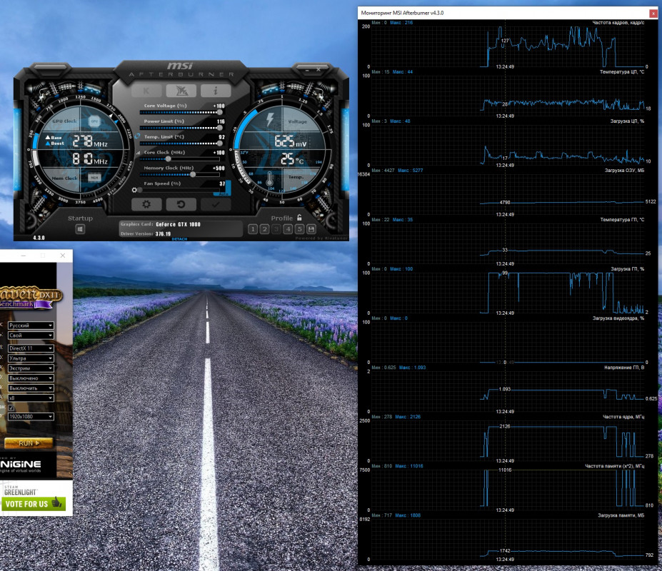 И так, на воздухе чип стабильно работал на частоте 2012, обороты оставил в режиме «авто». Напряжение не поднималось и составило 1.043 В. Память же, спокойно работала на частоте 11000 МГц, можно было поставить и 11400, но результат в тестах 3DMark снижался.