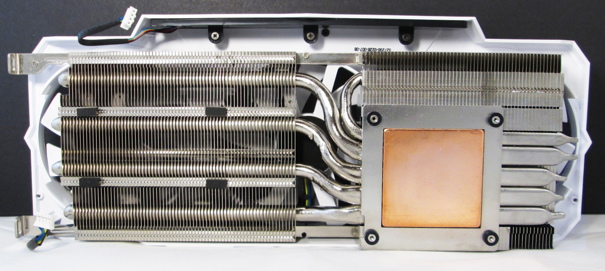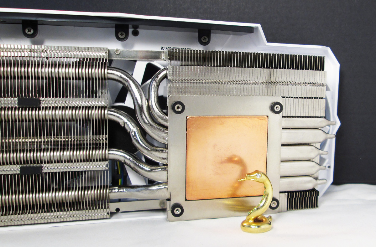 KFA не стали ничего изобретать, классический вариант, радиатор из 5 тепловых трубок, диаметр четырех – 8 мм и одной - 6 мм, контактируют с графическим чипом через медную пластину. Полировка не идеальная, но выполнена вполне прилично.