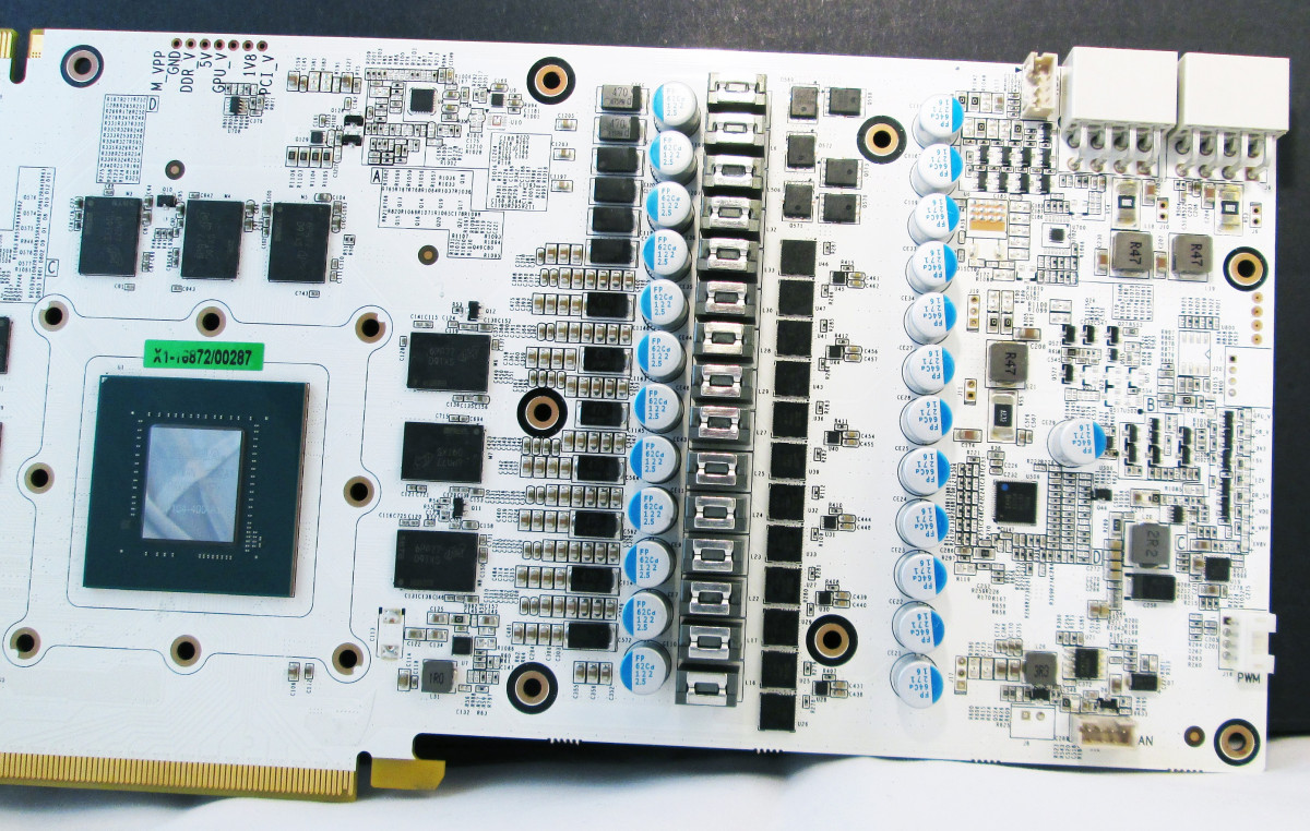 Сразу в глаза бросается внушительная система питания, из-за которой пришлось увеличивать ширину платы. 12 фаз отведено графическому чипу и еще три для памяти, главным же отличием от всех карточек нереференсного дизайна других производителей, является цифровой ШИМ контроллер, при помощи которого, в теории, можно повышать напряжение до 1.3 В, но для этого нужен специальный биос, который простым пользователям не достать.