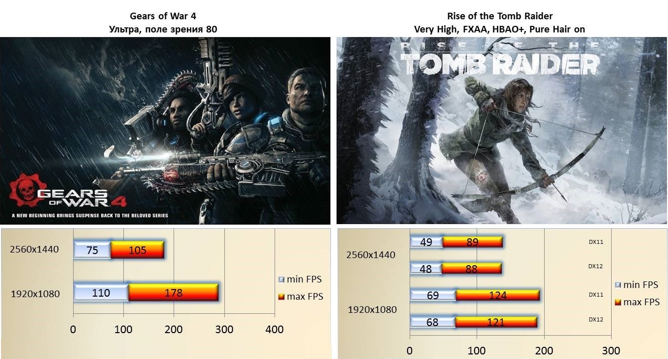 Для тестирования встроенные бенчмарки не использовались, а выбирался произвольный отрезок и записывался с помощью Nvidia Share, показания фиксировались с помощьюMSI Afterburner. Странная ситуация возникла с Gears of War 4, мониторинг MSI Afterburner не работал, как и Nvidia Share. Но работал фирменный счетчик fps и записывать видео можно с помощью панели Xbox в Win 10. Все игры устанавливались на SSD, подробные настройки можно посмотреть в тестовых отрезках. Видеокарта не разгонялась.