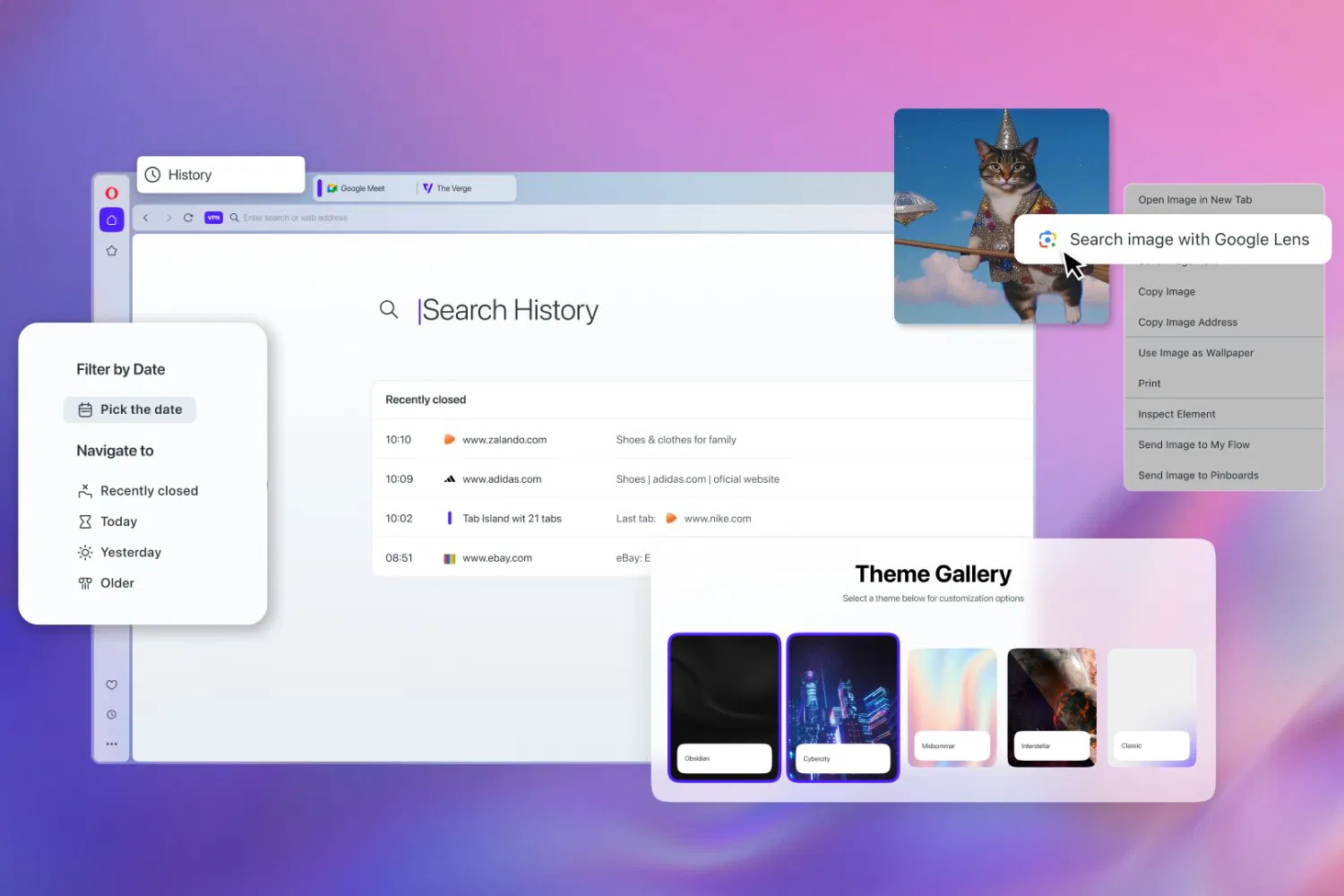 Компания Opera Software выпустила обновление для своего браузера Opera One. Ключевыми нововведениями стали измененный интерфейс истории просмотров, интеграция поиска по изображениям через Google Lens, 2 новые динамические темы и экспериментальная функция для пропуска видеоконтента.
