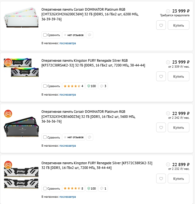 Я купил G.Skill DDR5 2X16 6000Mhz CL32.за $128 c США вместе с доставкой. За 2 месяца она упала до $110.