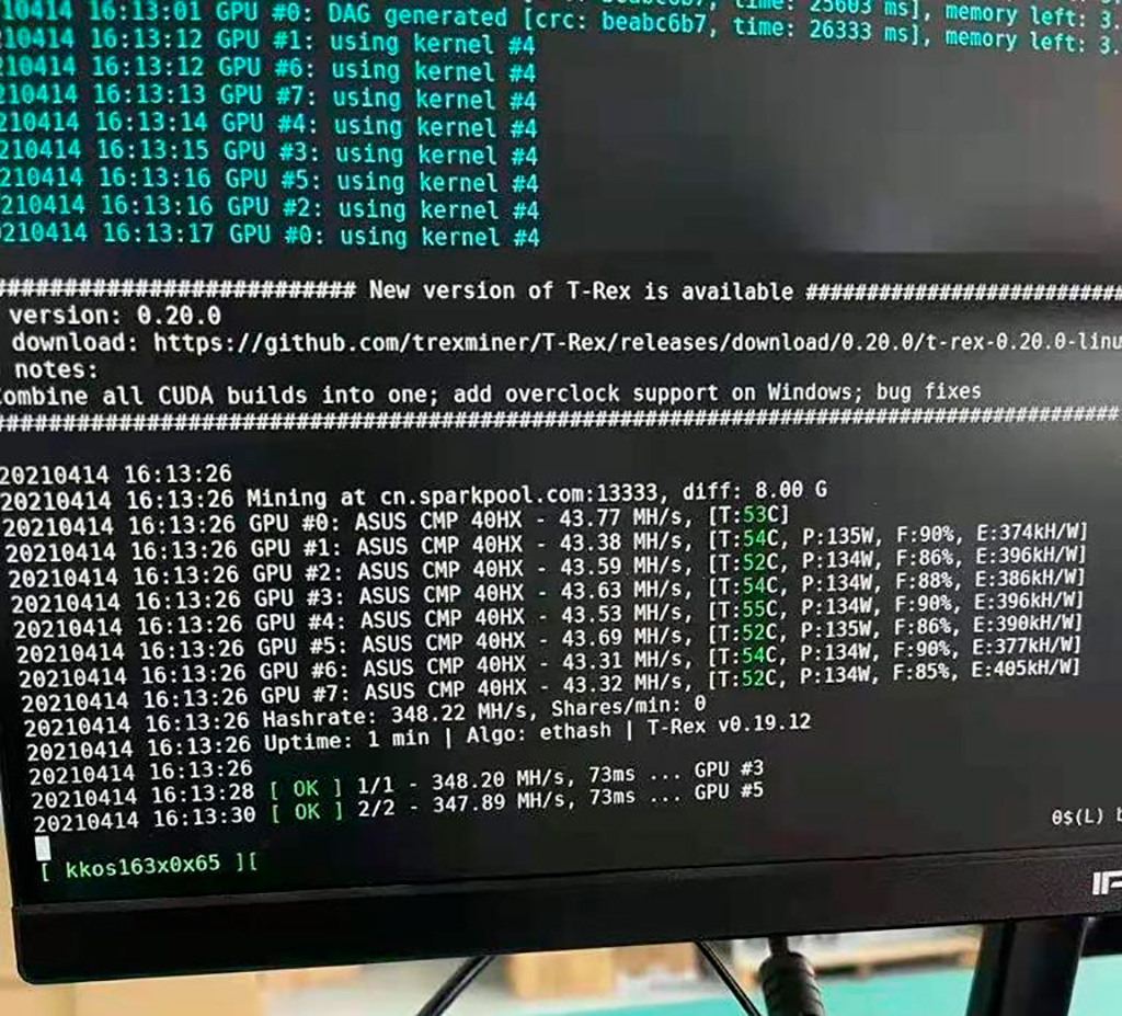 Согласно скриншоту, адаптер выдаёт 43,77 MH/s, что на 21% больше, чем заявленная NVIDIA производительность (36 MH/s). Работающие в составе фермы 8 видеокарт были оптимизированы по потреблению и разогнаны по памяти. Номинальный TDP равен 185 Вт, но здесь видеокарты довольствуются 135 Вт.