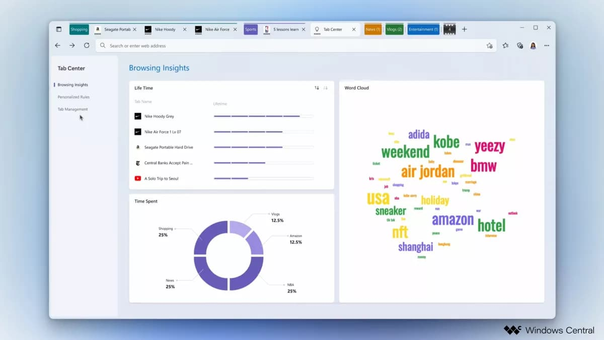 Microsoft также работает над новой функцией «Центр действий с вкладками», которая будет предоставит аналитические данные использования браузера по аналогии с «Экранным временем» на iPhone или «Цифровым благополучием» на Android.