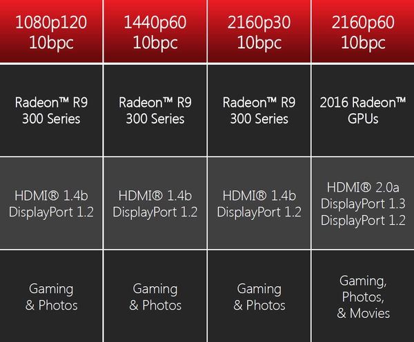 В существующие видеокарты Radeon R9 300-й серии можно внедрить поддержку HDR для игр и фотографий с 10 битами на канал в режиме 1080p120, 1440p60 и 2160p30. Однако для воспроизведения HDR-видео в режиме 2160p60 потребуется HDMI 2.0a или DisplayPort 1.3, и тут уже нужно дождаться следующего поколения графических процессоров AMD. Но пока еще рано делать какие-то выводы, ведь, по словам Майерса, HDR-дисплеи для массового рынка начнут появляться только во второй половине 2016 года.