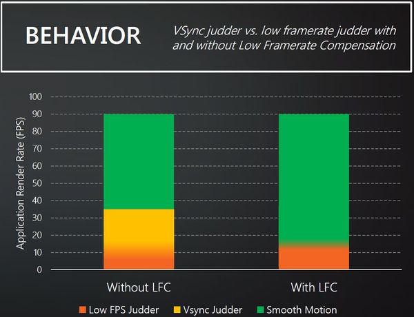 Добавление компенсации низкой частотой кадров (LFS – low framerate compensation) в драйвер Radeon Software Crimson Edition должно смягчить проблемы с разрывами/притормаживаниями кадров, которые ранее встречались на совместимых с FreeSync системах, когда частота кадров опускалась ниже минимального значения динамической частоты обновления дисплея. Если коротко, функция использует алгоритм, который отслеживает скорость работы приложения. Если скорость рендеринга падает ниже минимального порога, вставляется дополнительный кадр, который должен сохранить плавность смены изображения (с включенной вертикальной синхронизацией) и уменьшить разрывы кадров (с выключенной вертикальной синхронизацией). LFC автоматически включается на дисплеях с поддержкой FreeSync, у которых максимальная частота обновления в 2,5 раза выше минимальной.