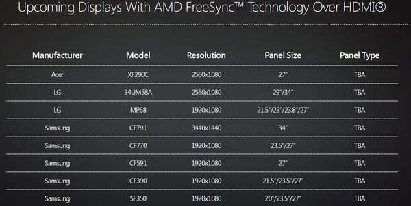 Ожидается, что совместимые мониторы воспользуются гибкостью данной технологии. Acer, LG и Samsung уже анонсировали в совокупности восемь моделей с поддержкой FreeSync через HDMI и разрешением от 1920x1080 до 3440x1440 точек. Хотя нам не известно, какие именно панели будут в них установлены, Дэвид Глен из AMD сказал, что они начнут появляться уже в первом квартале 2016 года.