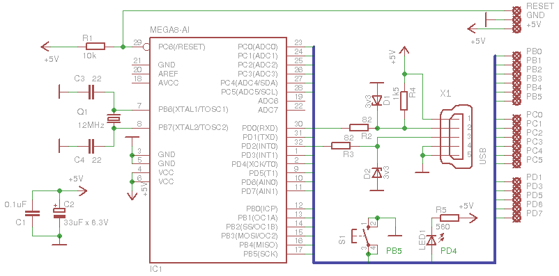 В журнале "Радио" №1 за 2007 г. опубликована статья С.Рюмика с описанием адаптера, позволяющего подключить к шине USB компьютера до четырех джойстиков от приставок Dendy, либо до двух джойстиков от SEGA MegaDrive-II или Sony PlayStation. Автор использует микроконтроллер ATMega8-16PI в корпусе DIP для прошивки которого на плату выведен разъем ISP-интерфейса последовательного программирования. Для работы с разным видами и разным количеством джойстиков предложен набор прошивок (всего 9 штук). Поскольку при подключении нескольких джойстиков вемя опроса увеличивается пропорционально их числу, для получения минимального времени отклика (для прошивки на один джойстик оно составляет 10мс, для двух - 20мс, для четырех - 40мс) есть смысл "заливать" именно ту прошивку, которая предназначена для этого количества джойстиков. Т.к. устройство подключается к ПК через шину USB, для смены прошивки вместо ISP-программатора очень удобно использовать USB-bootloader. Я развел печатную плату под SMD-компоненты и добавил в схему кнопку S1, которая служит для включения режима загрузчика. В результате схема адаптера выглядит так:
