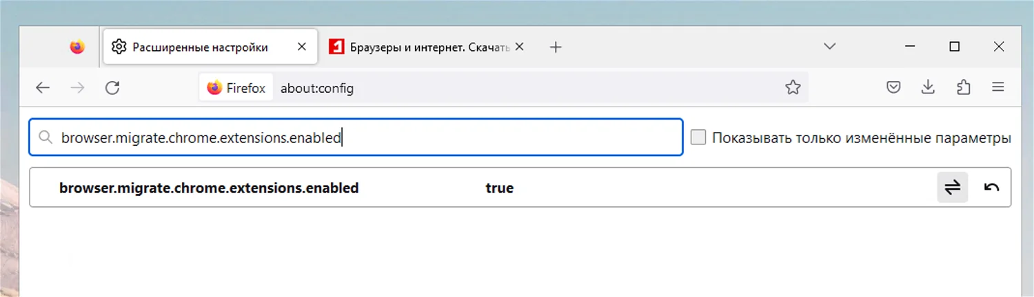 - Установите значение true для параметра browser.migrate.chrome.extensions.enabled