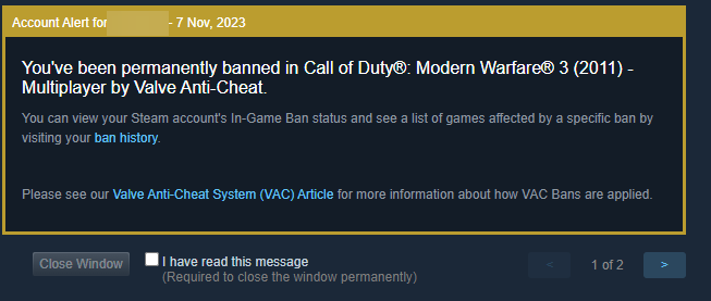 Мне тоже пришло сообщение о вак бане в COD MW3. Хотя ее у меня даже нет в библиотеке) это что за прикол?