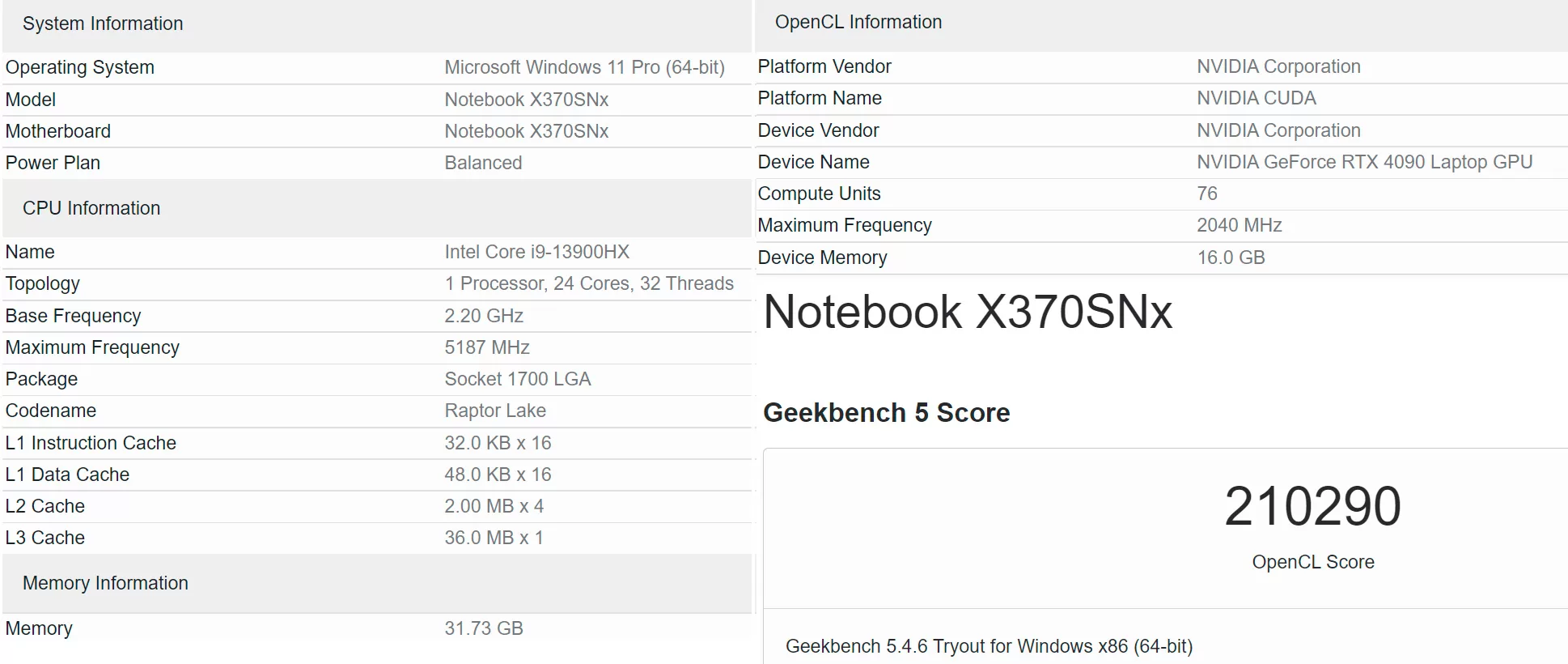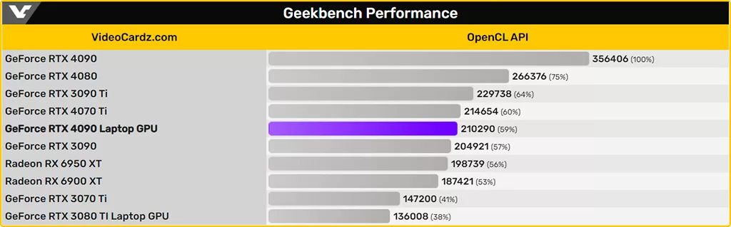 Ноутбучная RTX 4090 была замечена в Geekbench – менее точном мериле производительности, чем 3DMark. Её производительность сопоставима с полноценной десктопной RTX 3090, или на 54% быстрее, чем лучшая актуальная мобильная карта NVIDIA – RTX 3080 Ti.