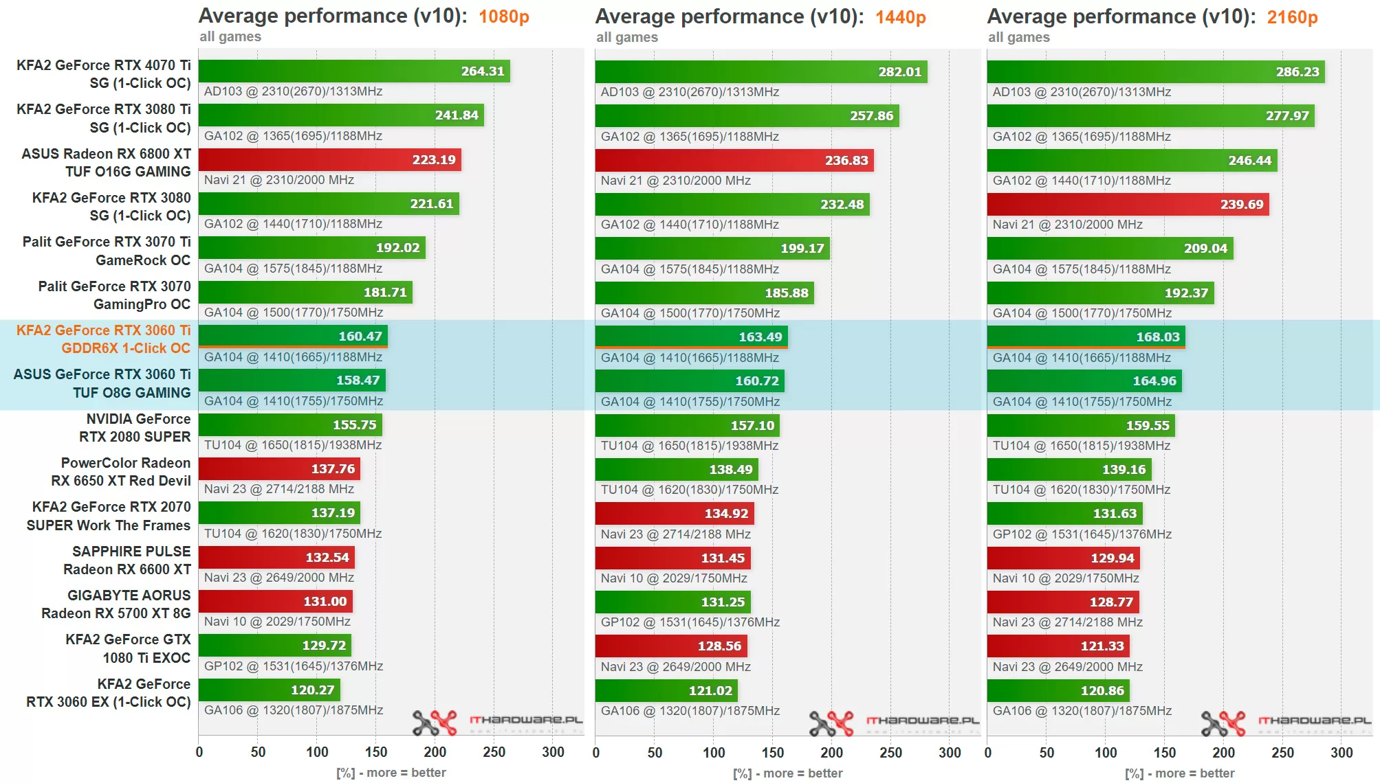 Видеокарта сравнивалась с «обычной» RTX 3060 Ti на памяти GDDR6. Переход на чипы GDDR6X обеспечил прирост на 6-7%. Фактически карты отличаются на 1-2%, но версия с GDDR6 имела заводской разгон GPU на 5%. Собственно, о 7% разницы говорили ещё октябрьские утечки в 3DMark.