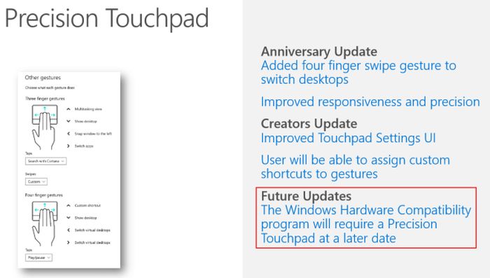 C выходом следующих после Creators Update обновлений для Windows 10 оснащение ноутбуков так называемыми «Precision Touchpads» («точные тачпады») станет обязательным условием, если устройство претендует на то, чтобы его украшала наклейка «Windows 10 Compatible». Иначе говоря, в недалеком будущем ноутбуки без Precision Touchpads не будут получать одобрение Microsoft, даже если производитель выполнит все прочие условия программы совместимости оборудования с Windows 10.