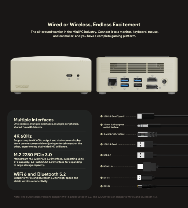 Мини-ПК поддерживает работу с Wi-Fi 6 и Bluetooth 5.2. Из портов на задней панели предусмотрены три USB 3.2 Gen2, USB 3.1 Type-C, HDMI 2.0, DisplayPort 1.4 и Ethernet. Retro Mini PC AM01 поставляется с предустановленной Windows 11.