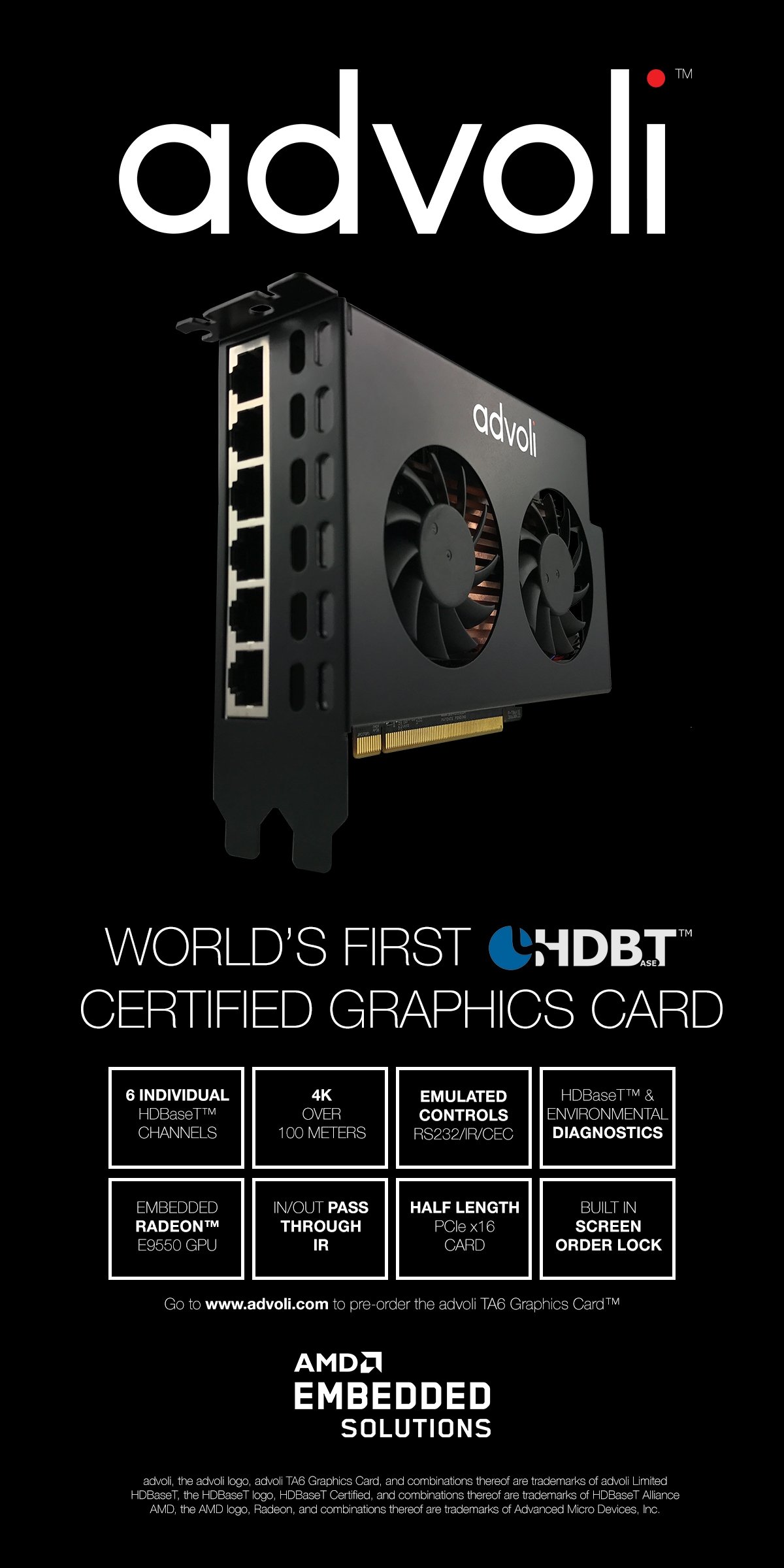 Мало кому известная компания Advoli представила первую в мире видеокарту с интерфейсом PCI Express x16, сертифицированную альянсом HDBaseT. Вместо видеопортов на адаптере TA6 Graphics Card расположены шесть портов Ethernet с поддержкой спецификаций HDBaseT. Спецификации HDBaseT вышли в чистовом варианте летом 2010 года. Они предусматривают передачу по витой паре 5 и 6 категорий не только сигнал Ethernet 100 Мбит/с и 1 Гбит/с, но также управляющие сигналы, питание до 100 Вт, аудио и видео со скоростью от 10,2 Гбит/с до 20 Гбит/с.