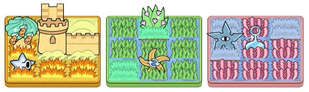 Значительно уменьшив размер мозаики, я придал каждой лужайке чёткий и уникальный внешний вид. На каждой лужайке есть один тип опасного рельефа (ниже вы видите Лихорадную траву, Тониводоросли и Шипотрав), один тип существ и один тип антуража. Все эти элементы с механической точки зрения уникальны, то есть прохождение каждой лужайки требует своей тактики.