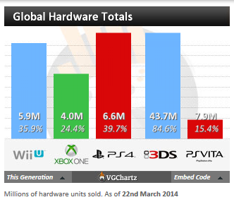 Сейчас на консоли Sony можно наслаждаться такими вещами как Assassins Creed IV: Black Flag, Killzone: Shadow Fall, Call of Duty: Ghosts, Knack, Battlefield 4 и FIFA 14. Всего более 30 игр, и при этом ожидается выход в свет таких проектов как Metal Gear Solid V, Watch Dogs и InFamous Second Son. Пока неизвестно точно о ходе продаж детища корпорации Microsoft, но 24 апреля компания обнародует свою финансовую отчетность и тогда мы сможем оценить объемы реализации и ее дальнейшие перспективы, которые пока видятся в не совсем радужном свете.