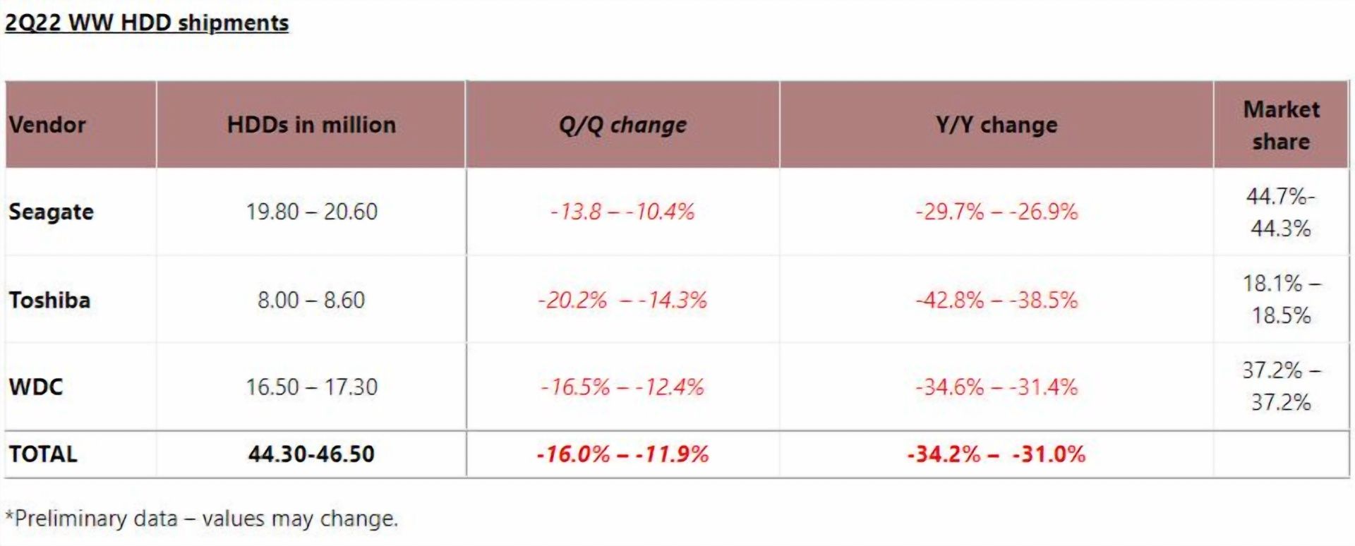 По сравнению с предыдущим годом во втором квартале 2022 было продано жестких дисков на 31-34,2% меньше. Наиболее существенное падение наблюдается у Toshiba, здесь оно составило 41%. В случае Western Digital мы получили падение на 33%, а у лидера рынка Seagate – около 28%. Три производителя в общей сложности продали между 44,3 и 46,5 млн. жестких дисков.