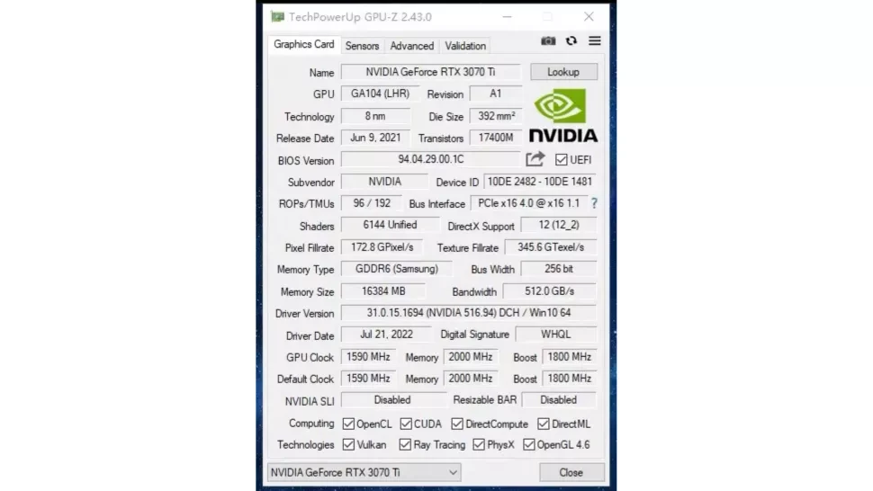GPU-Z показывает базовую тактовую частоту 1590 МГц и буст 1800 МГц, что соответственно на 25 и 30 МГц быстрее, чем у RTX 3070 Ti 8 ГБ. Карта использует память GDDR6 вместо GDDR6X. Это означает, что пропускная способность ниже - 512 ГБ/с против 608 ГБ/с у RTX 3070 Ti 8 ГБ.